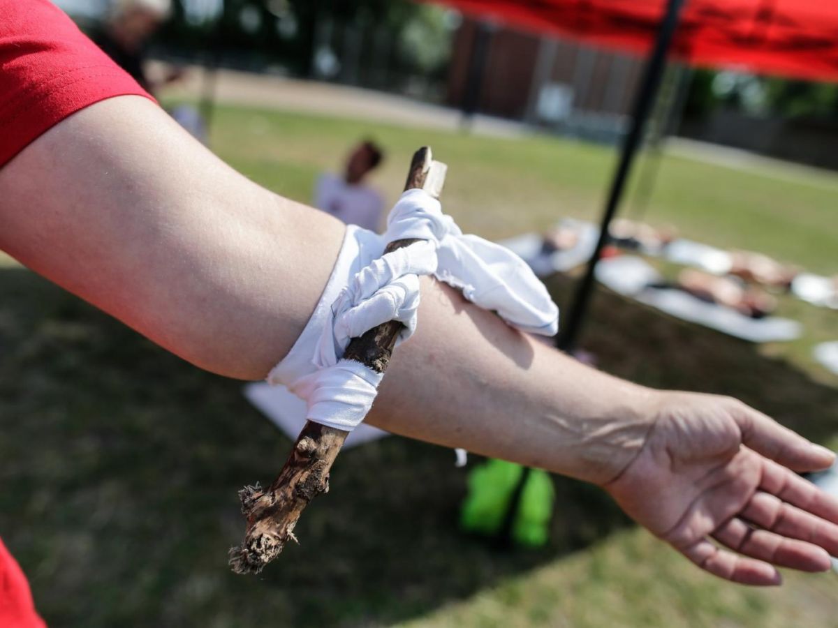 Garrot : En dernier recours, si le saignement ne s’arrête pas malgré la pression directe, appliquez un garrot à environ 5 cm au-dessus de la plaie. Il est crucial de noter l'heure de pose pour les secours, car le garrot ne doit pas être maintenu plus de deux heures.